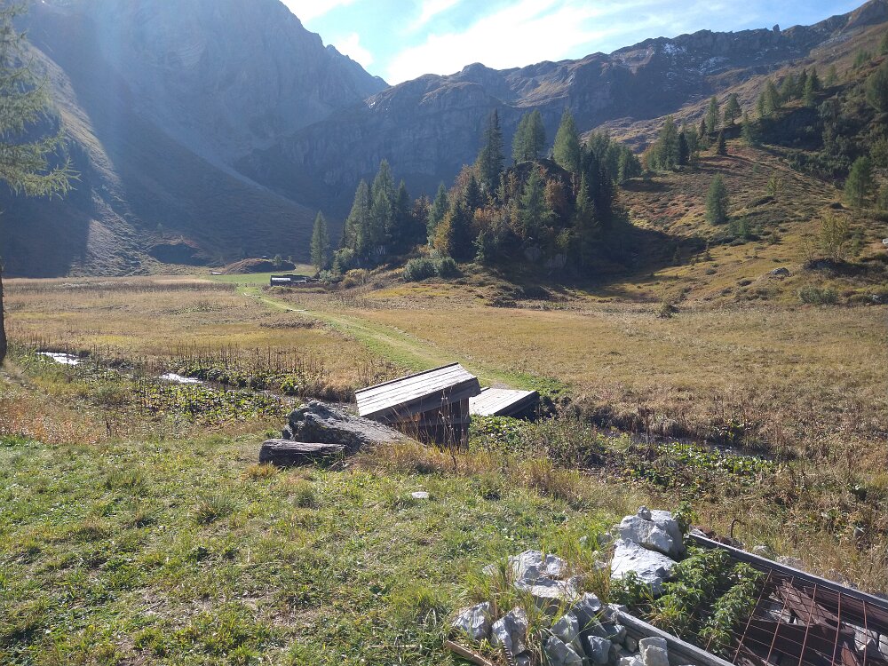 Abseits des Normalwegs vom Obstanser Boden zur Hütte, gibt es noch einen Steig, auf dem die Einheimischen auch ihre Kühe zum See hochtreiben. Den wollen wir heute mal ausprobieren und biegen dazu vom Obstanser Boden rechts ab in Richtung Gatterspitze und Vorderalm. Ganz einsam und wunderschön ist es hier. Ganz hinten im Kar befindet sich eine Hirtenhütte. Hier gibt es auch noch einen Wegweiser Gatterspitze und Obstanser Hütte. Anfangs finden wir noch rote Markierungen in Richtung Hütte und See, die wir dann aber verlieren. Teils weglos kommen wir höher, finden schließlich auch den Steig wieder und gelangen wohlbehalten oberhalb der Hütte auf das wunderschöne Gebiet um den See.