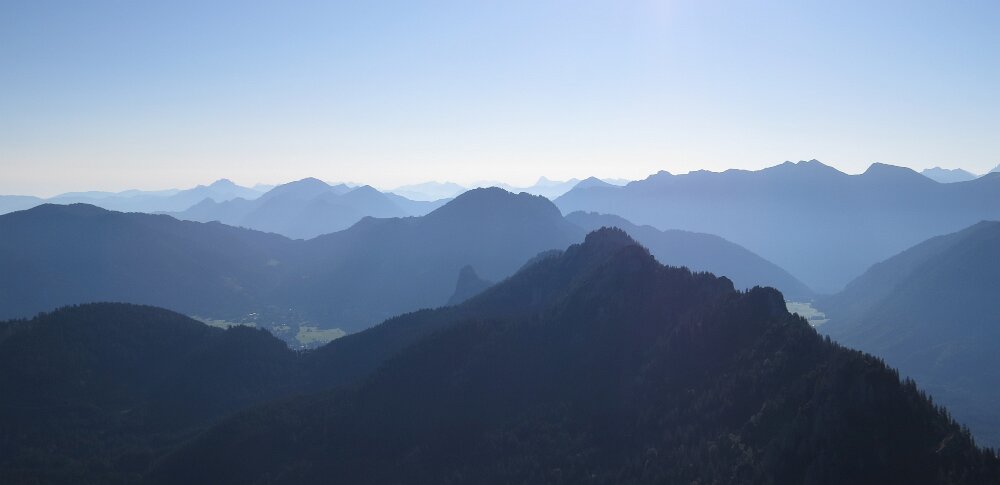 Der Mond in der Nacht davor Wir wollten den Sonnenaufgang von ganz oben sehen, aber dazu waren wir zu langsam. Am Grat über der Kuhalm angekommen. Am Horizont: Hinteres Sonnwendjoch links, Halserspitz und rechts der Wilde Kaiser Leider sind wir fast noch im Wald, als die Sonne über den Bergen aufgeht. Am Teufelstättkopf-Grat angelangt Zoom nach Osten Der Wilde Kaiser etwas deutlicher Am Grat kurz vorm Abzweig zum Kreuz Auf dem Stein Blick zum Sonnenberggrat und Estergebirge Der gute alte Enton:-) Aussicht nach Osten am Grat Teufelstättkopf und Laubeneck Scheinberg Hochblasse Hochplatte und Krähe Meine Heimat Oberammergau mit dem Kofel Schöne blaue Berge hinter den Bergen Kreuzspitze und Kuchelbergkopf Geierköpfe Krähe, Gabelschrofen, Gumpenkarspitze Hennenkopf 1769 m Ammergauer Alpen von Norden über Kuhalm - Hengstwald - Kleckelalpe - Wegsuche 11.08.23 Osttirol Kartitsch Dorfberg 2115 m 24.09.2023
