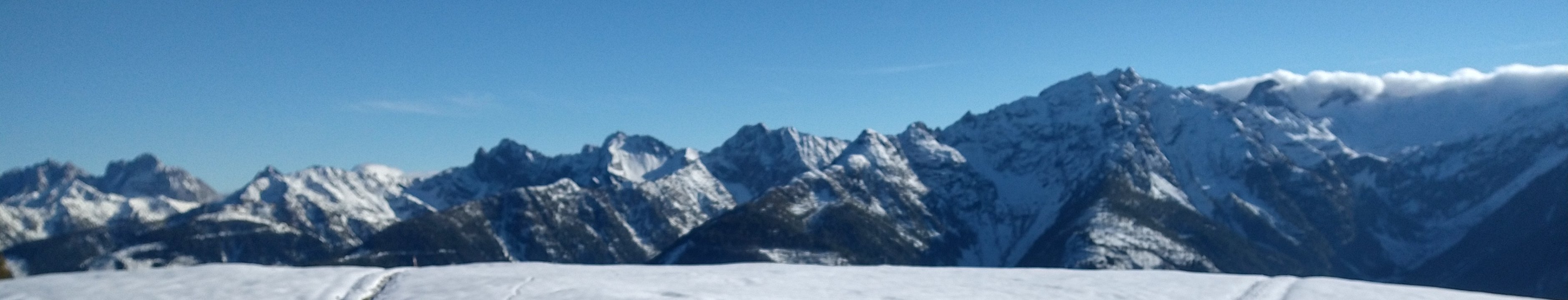 Über immer wieder neue Geländestufen geht es hoch und immer fragt man sich, wann man denn wohl oben ist. An einer schönen, neueren Hütte beginnt die durchgehende Schneedecke und auf den im Sommer sicher wunderschönen Almwiesen stapfen wir hoch zum Tisch und Kreuz, dem "Samalm-Gipfel", wie auf einer Skitour. Die Aussicht ist schön, aber die weiße Schneedecke statt noch ein paar Blümchen und Gras stört irgendwie.