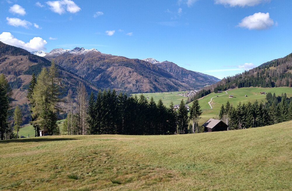 Wir fahren in Richtung Obertilliach und biegen vor Bachhäusl nach Flatsch ab. Wir fragen oben an dem letzten Bauernhof, wo schon überall Parkverbotsschilder stehen. Wahrscheinlich werden die Höfe in der Saison voll zugeparkt, das wollten wir auch nicht. Wir dürfen unser Auto dann in der einzigen kleinen Bucht an der Straße unterhalb reinquetschen und starten zuerst auf der Teerstraße, später Forststraße nach oben.