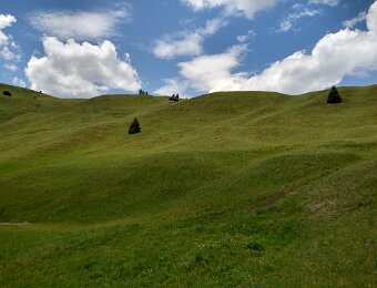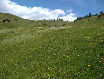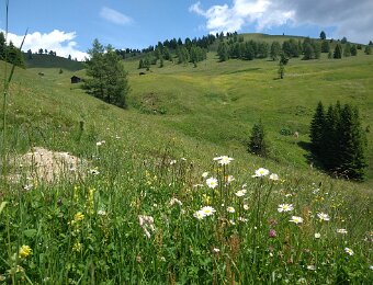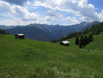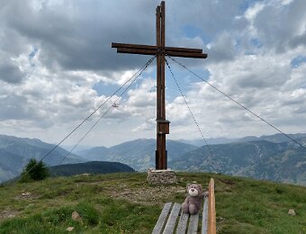 Das Wetter wird unbeständig, Gewitter sind im Anmarsch. Große Touren sind nicht ratsam, aber der Dorfberg geht eigentlich immer. Bei Sonne und blauem Himmel gehen wir in Leiten los, aber schon am Gipfelkreuz ist der Himmel bedeckt und rundherum zeigen sich abenteuerliche Wolkengebilde. Die heranziehenden Gewitter zeigt die Wetterapp ganz deutlich und so haben wir uns schon im Aufstieg einen leeren Heuschupfen zum Unterstehen ausgesucht.