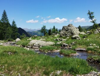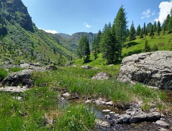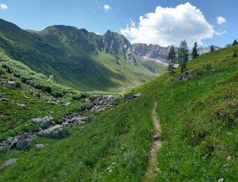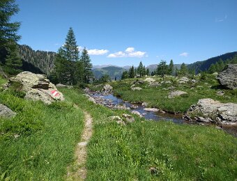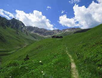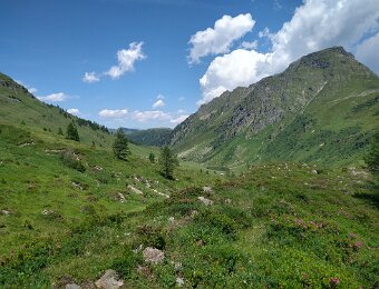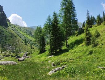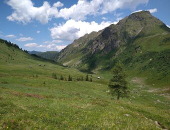 In den letzten Sonnenstrahlen geht es dann wieder weglos nach unten zu den zwei Hütten über dem Unteren Stuckensee und die steilen Wiesenhänge mit den vielen Orchideen zurück zum Weg und von da runter zum Leiterfall.