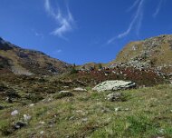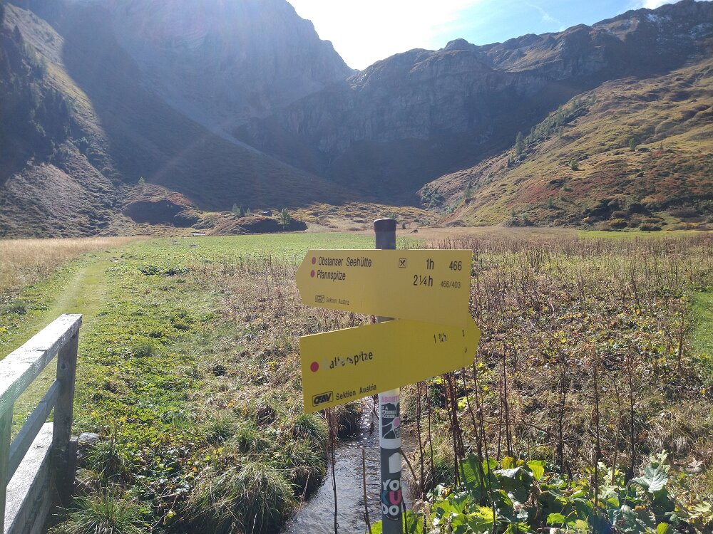 Abseits des Normalwegs vom Obstanser Boden zur Hütte, gibt es noch einen Steig, auf dem die Einheimischen auch ihre Kühe zum See hochtreiben. Den wollen wir heute mal ausprobieren und biegen dazu vom Obstanser Boden rechts ab in Richtung Gatterspitze und Vorderalm. Ganz einsam und wunderschön ist es hier. Ganz hinten im Kar befindet sich eine Hirtenhütte. Hier gibt es auch noch einen Wegweiser Gatterspitze und Obstanser Hütte. Anfangs finden wir noch rote Markierungen in Richtung Hütte und See, die wir dann aber verlieren. Teils weglos kommen wir höher, finden schließlich auch den Steig wieder und gelangen wohlbehalten oberhalb der Hütte auf das wunderschöne Gebiet um den See.