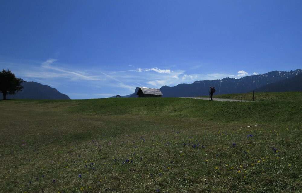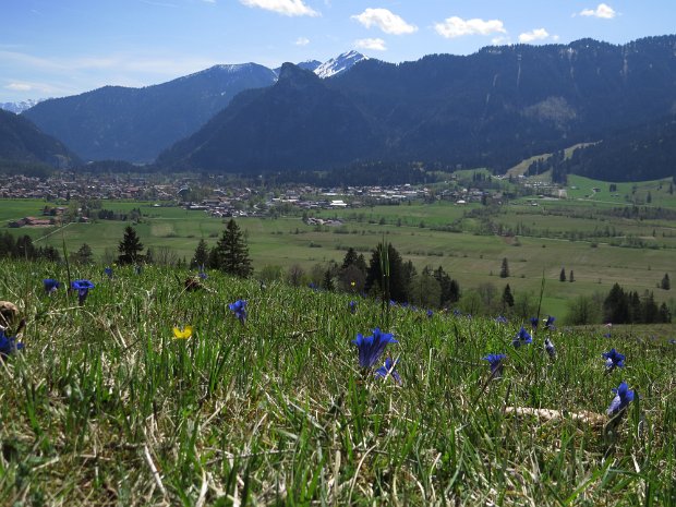 Von Unterammergau über den schönen Wiesmahdweg zum Hebammsberg. Im Frühling viele Enziane, Primeln und mehr.