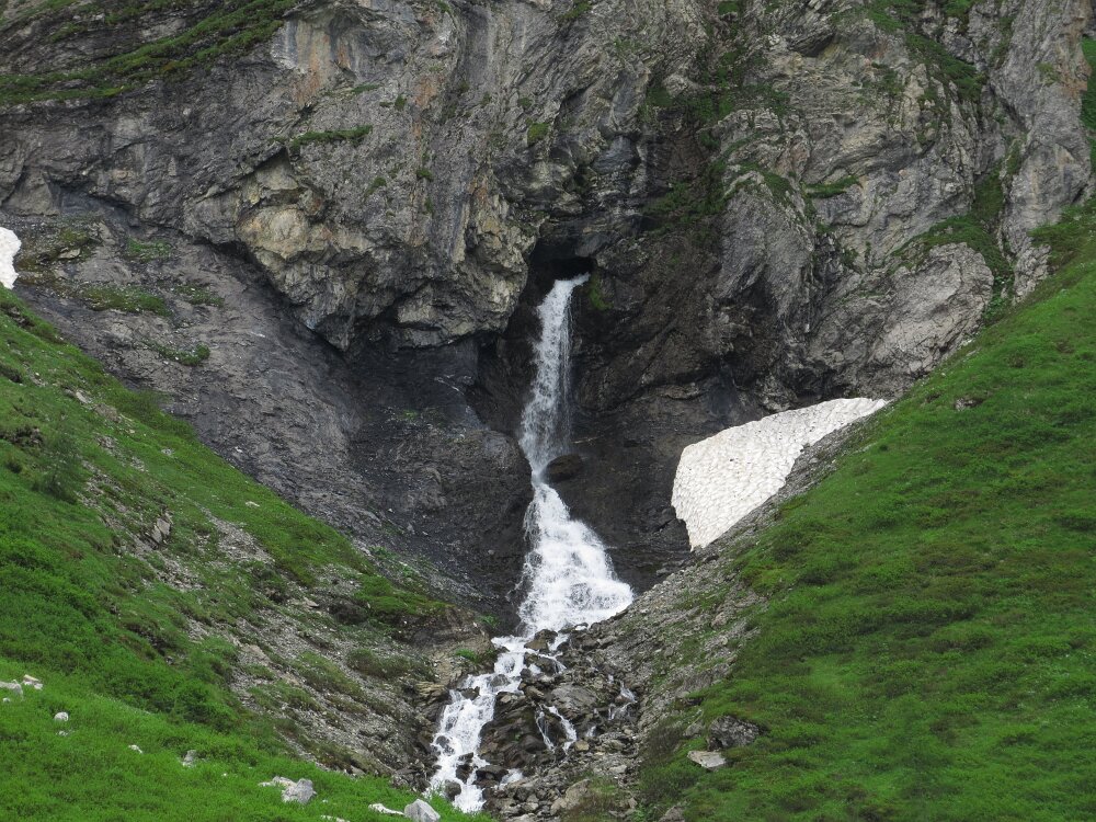 Vom Radldepot sind es nur 5 Minuten bis zum Wasserfall. Oben unter dem hohen Felsen führt der Weg über viele Stufen über den Wasserfall zum Obstanser Boden.
