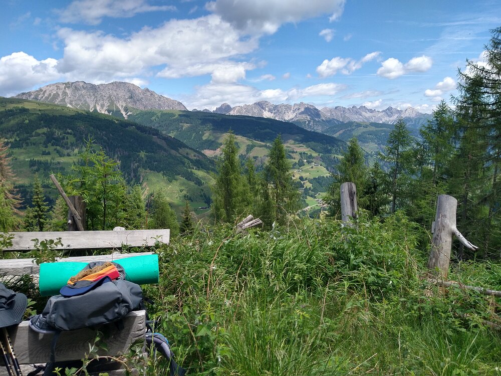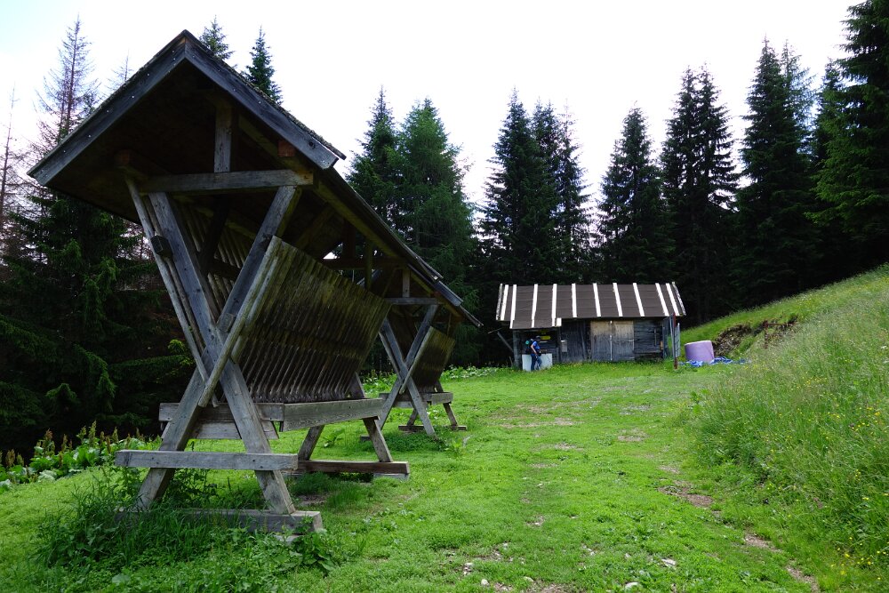 An der großen Sangeralm geht ein kaum sichtbarer Steig im Wald ab und hoch zu einer kleineren, ziemlich eingewachsenen und von außen fast schon verfallenen Hütte. Die Aussicht von hier ist bescheiden und ich will endlich über die Baumgrenze.