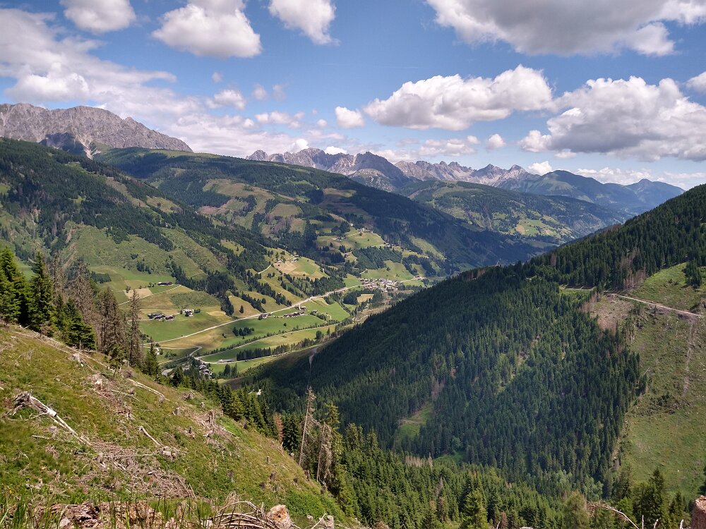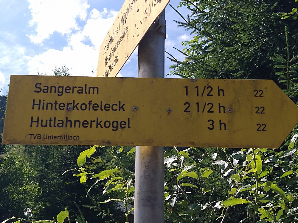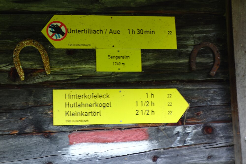 Mit dem Auto darf man hier nicht reinfahren, deshalb parken wir an den Soldhäusern bei Winkl. Anstatt unten das ganze Tal hochzulaufen, wählen wir den langweiligen Aufstieg über die nicht enden wollende Forststraße hoch zur Sangeralm. Blöde Idee. Unten steht auf einem Schild 1 1/2 Stunden Sangeralm. Wir brauchen aber viel länger, obwohl wir keine Pausen machen.
