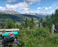 Im Wald an der verfallenen Hütte geht ein Steig hoch zum Hinterkofelegg, das komplett von Alpenrosen und niedrigem Gestrüpp bedeckt ist. Hier kann man endlich einmal rundherum gucken.