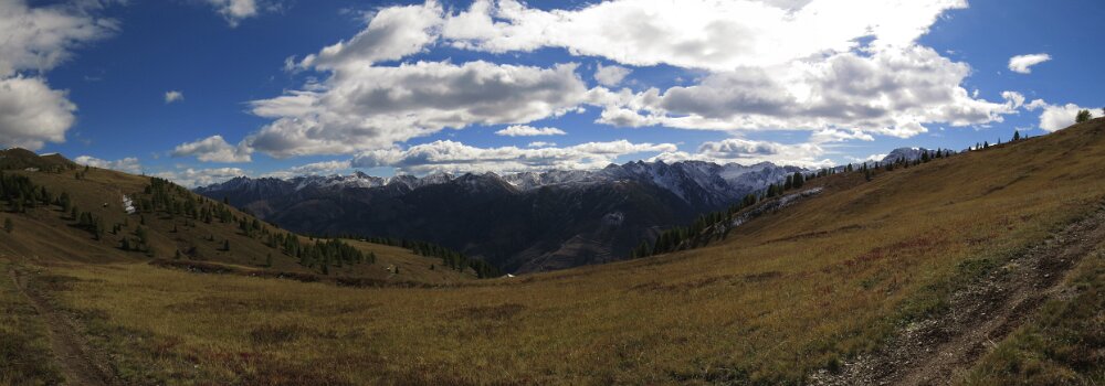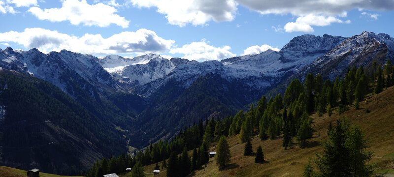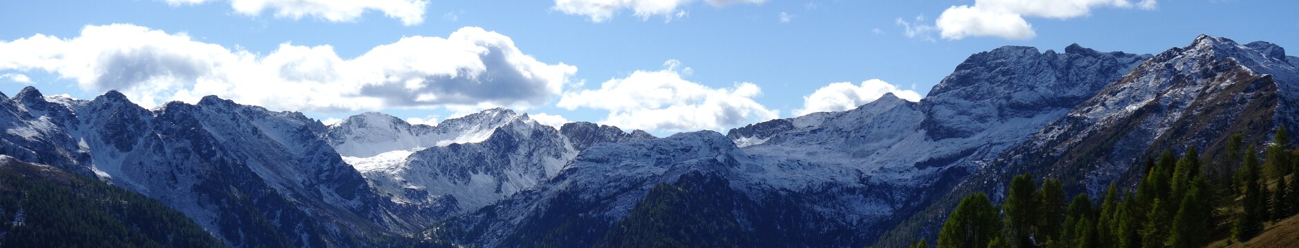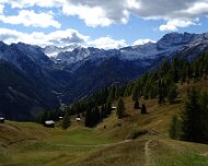 Gölbner 2943 m, Finsterkofel, Bockstein 2805 m, Große Ohrenspitze, Paterskopf, Zarspitzen 2778 m, Reiserspitze 2582 m von li. Unten Goll und Anras