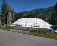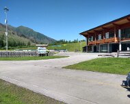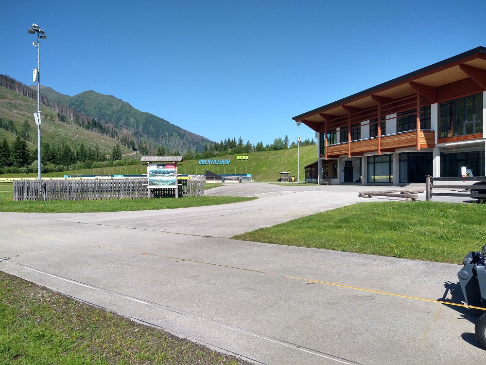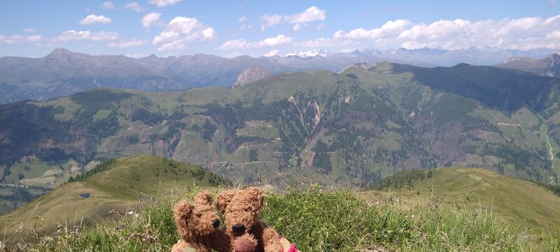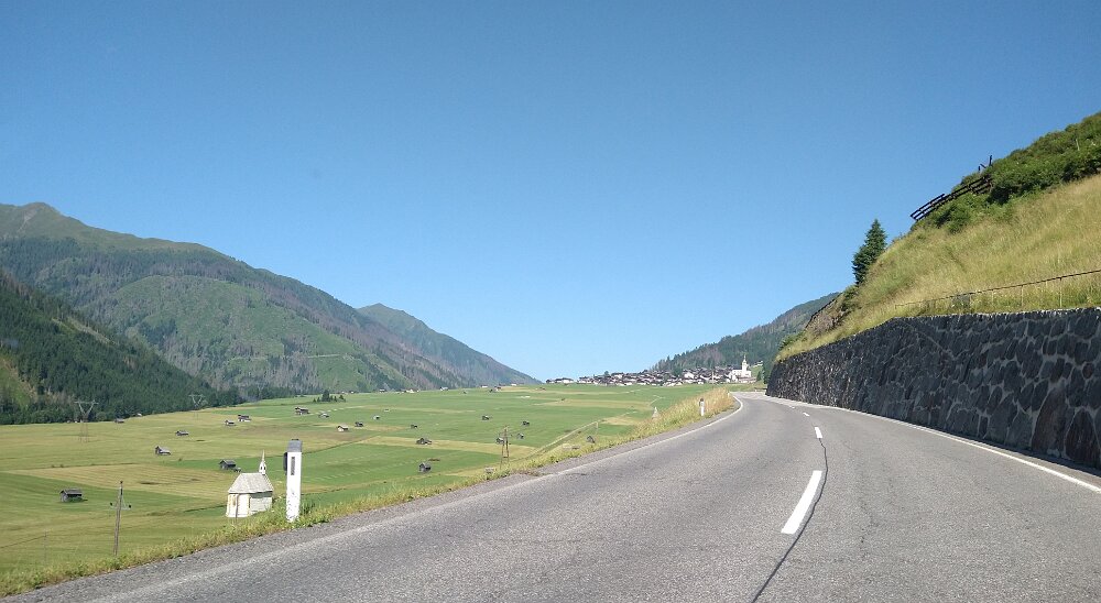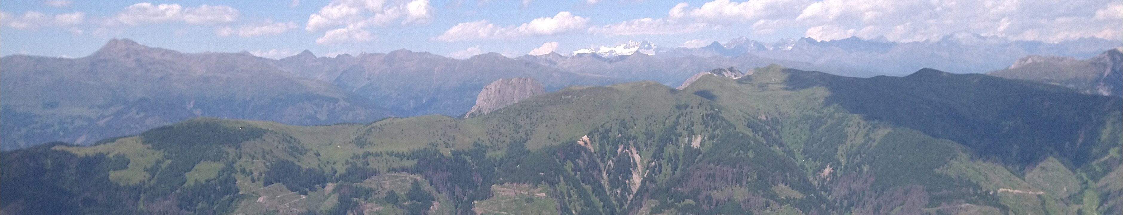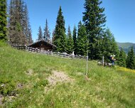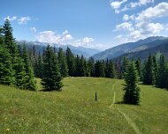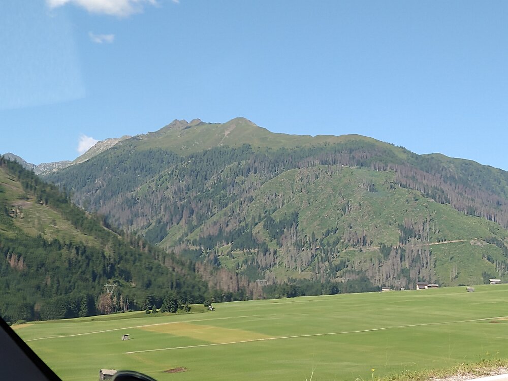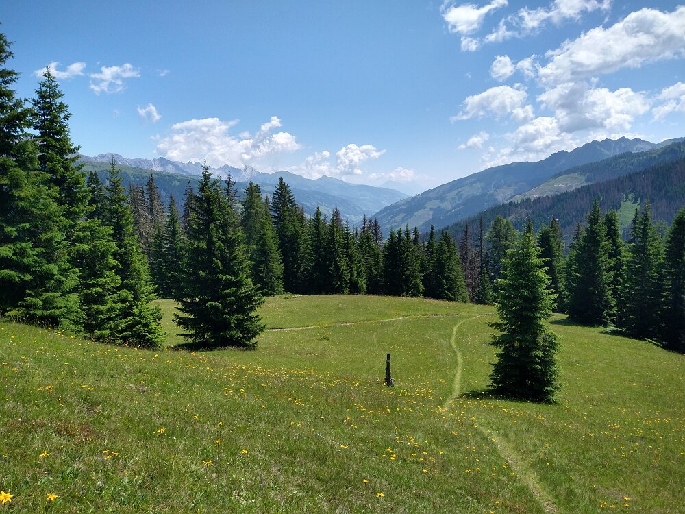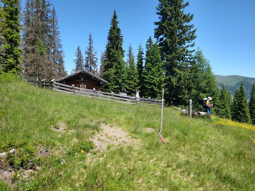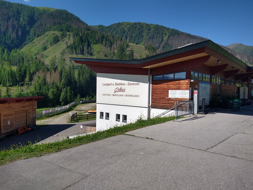 Vom Biathlonzentrum in Obertilliach, wo man gut parken kann, gehen wir los, um zum Aufstiegsweg zu gelangen. Ein Steig quert immer mal wieder die Forststraße, bevor an einer schön gelegenen Alm der Weg im Wald verschwindet und wir unter dem breiten Rücken des Zwiesel über der Baumgrenze raus kommen.