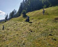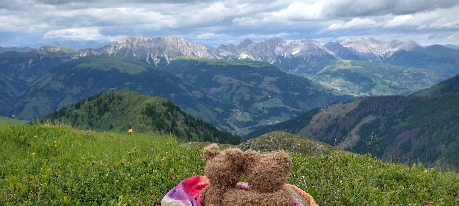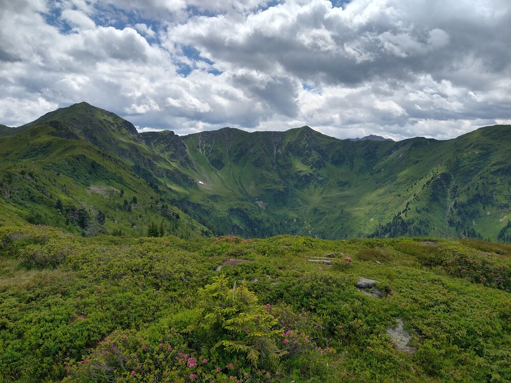 Im Wald an der verfallenen Hütte geht ein Steig hoch zum Hinterkofelegg, das komplett von Alpenrosen und niedrigem Gestrüpp bedeckt ist. Hier kann man endlich einmal rundherum gucken.