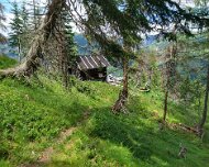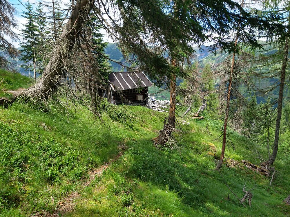 An der großen Sangeralm geht ein kaum sichtbarer Steig im Wald ab und hoch zu einer kleineren, ziemlich eingewachsenen und von außen fast schon verfallenen Hütte. Die Aussicht von hier ist bescheiden und ich will endlich über die Baumgrenze.