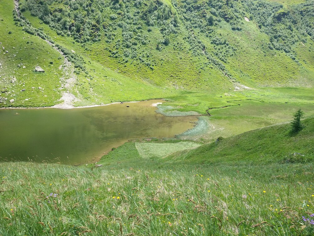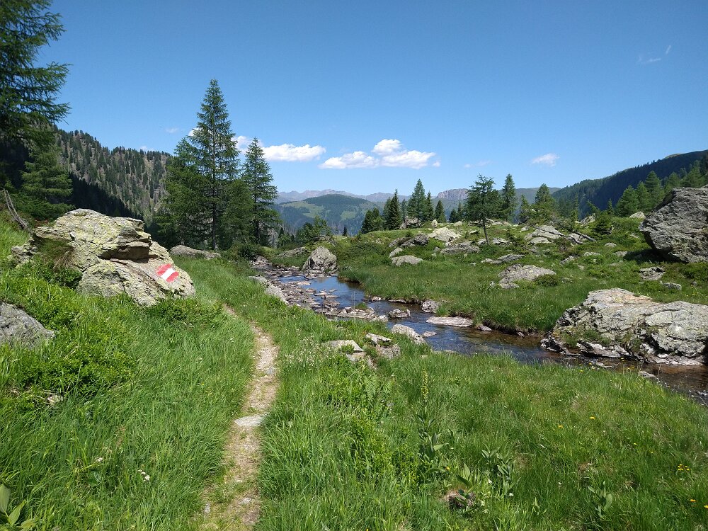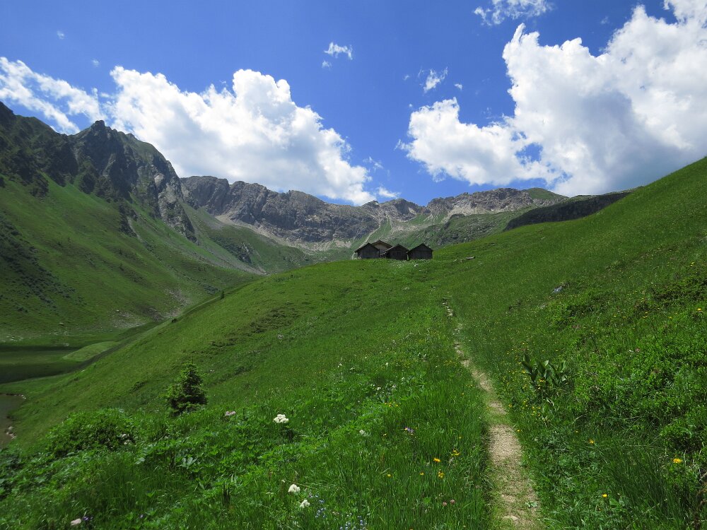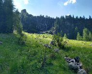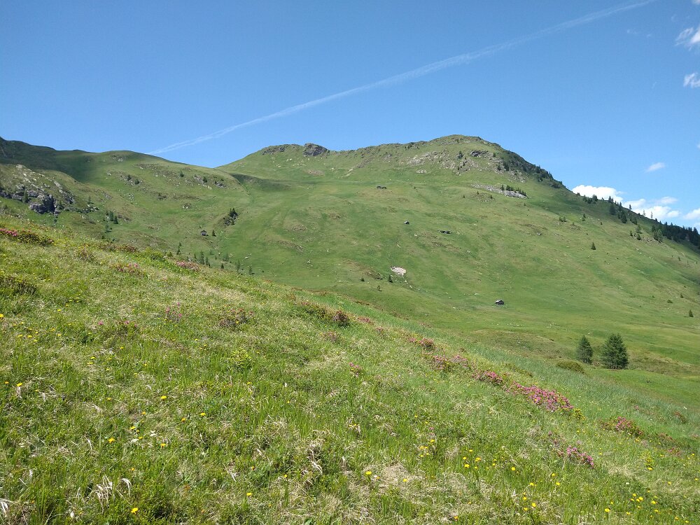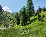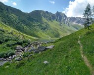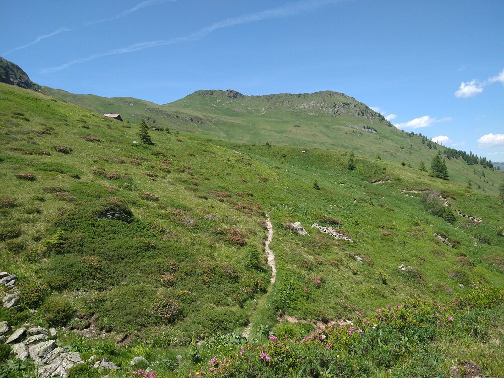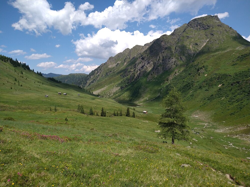 In den letzten Sonnenstrahlen geht es dann wieder weglos nach unten zu den zwei Hütten über dem Unteren Stuckensee und die steilen Wiesenhänge mit den vielen Orchideen zurück zum Weg. Von da runter zum Leiterfall.
