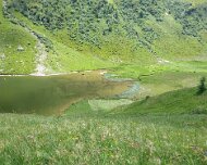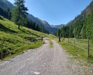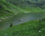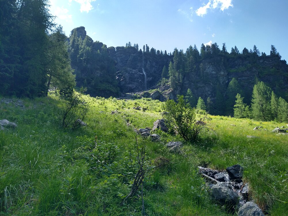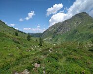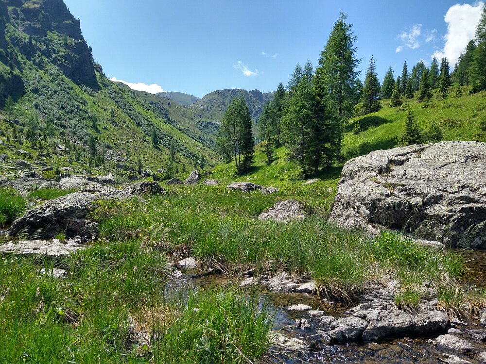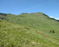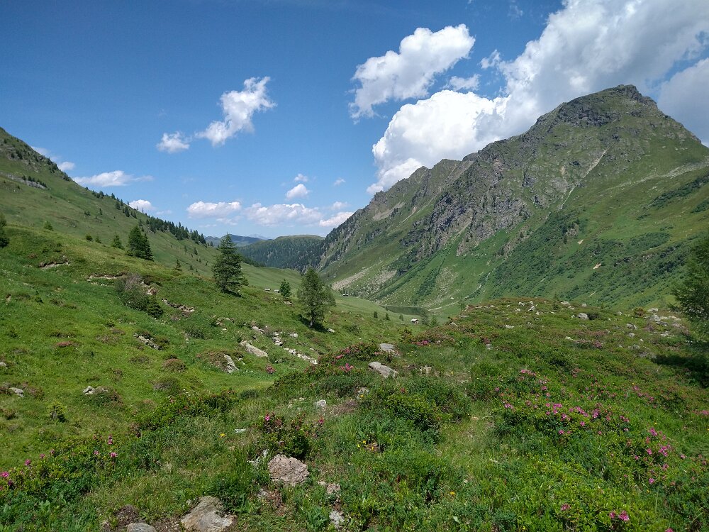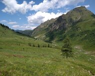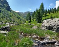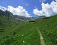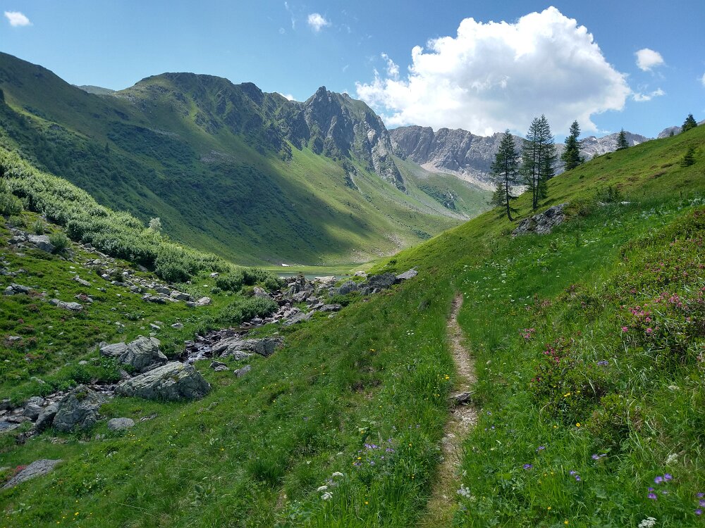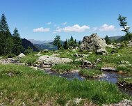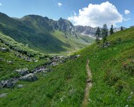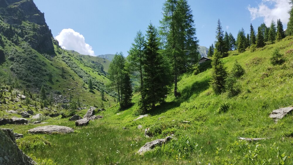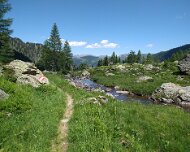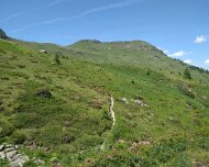 In den letzten Sonnenstrahlen geht es dann wieder weglos nach unten zu den zwei Hütten über dem Unteren Stuckensee und die steilen Wiesenhänge mit den vielen Orchideen zurück zum Weg. Von da runter zum Leiterfall.